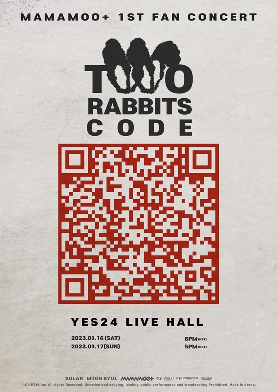 23일 소속사 RBW에 따르면 마마무+는 오는 9월 16~17일 양일간 서울 광진구 YES24라이브홀에서 첫 팬콘서트 'MAMAMOO+ 1ST FAN CONCERT 'TWO RABBITS CODE''(이하 'TWO RABBITS CODE')를 열고 팬들과 만난다.