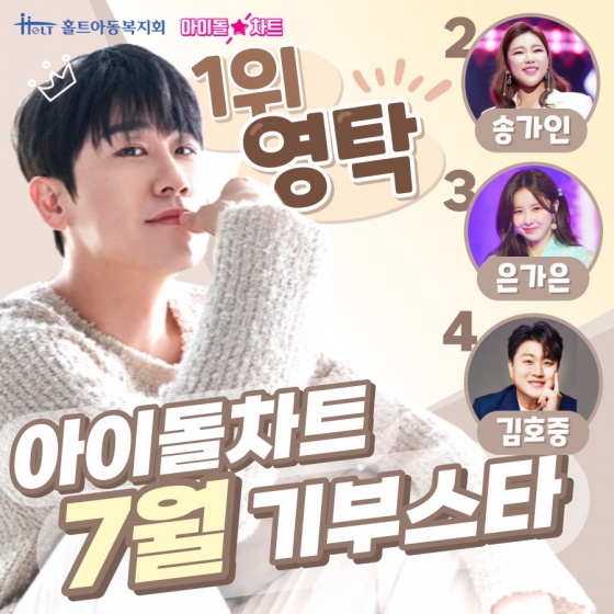 2021년 4월부터 27개월간 꾸준히 아이돌차트 1위를 차지한 영탁의 뒤를 이어 송가인, 은가은, 김호중이 아이돌차트 7월의 기부 스타에 이름을 올렸다.