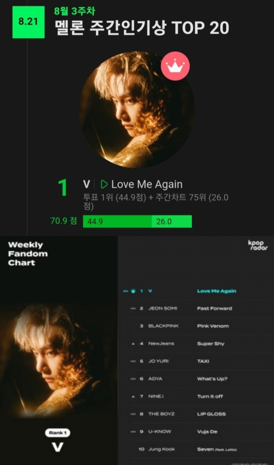 방탄소년단(BTS) 뷔의 선공개 곡 '러브미 어게인'(Love Me Again)이 8월 3주 차 멜론 주간 인기상을 수상하며 음원 강자의 면모를 입증했다.
