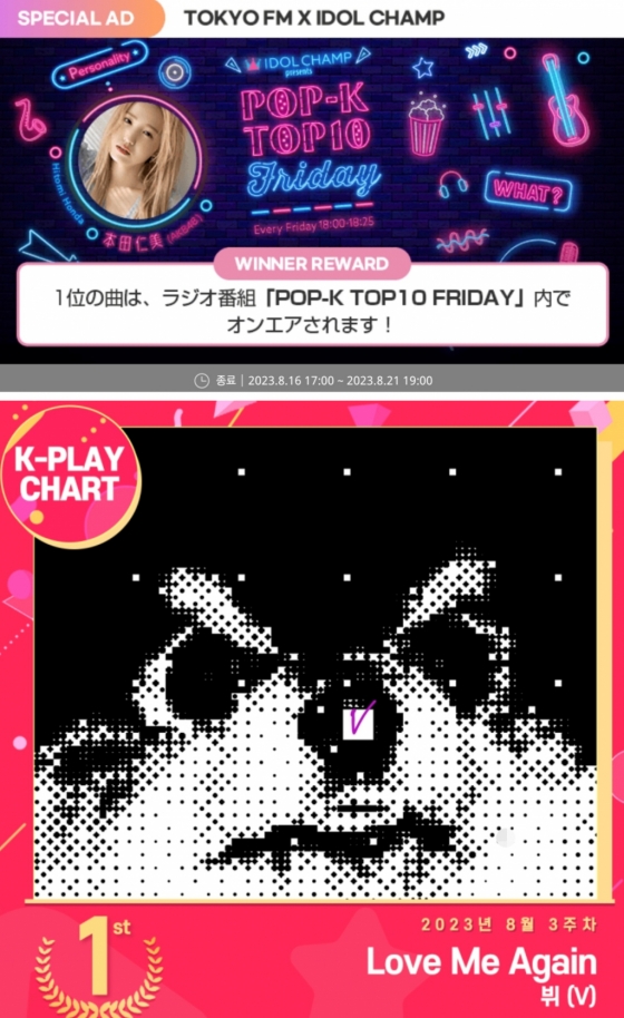 이 밖에도 뷔의 '러브미 어게인'은 글로벌 팬덤 플랫폼 '스타플레이'(STARPLAY)에서 8월 15일부터 22일까지 진행한 'K-PLAY CHART'에서 1위, '아이돌챔프'(idolchamp)에서 8월 16일부터 21일까지 진행한 'IDOL CHAMP presents POP-K TOP10 Friday' 설문에서도 1위에 올랐다. 36.94%의 득표율로 1위에 오른 '러브미 어게인'은 일본 TOKYO FM 라디오에 집중 방송된다.