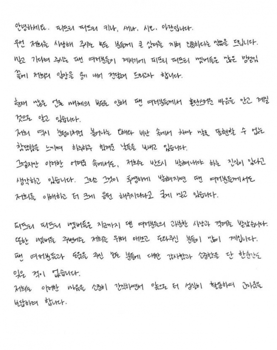 멤버들은 6월 19일 어트랙트와의 결별을 선언한 지 60일 만인 지난 17일 자필 편지로 심경을 밝히고 "저희를 사랑해주시는 모든 분들께 심려를 끼쳐드려 죄송하다는 말씀을 하고 싶다"라면서 "이번 일을 계기로 소속사와의 관계에서는 잘못된 방식으로 강요돼 왔던 일들이 바로잡히길 원하고 있다. 그 실현을 위해 진실에 입각한 증거와 자료를 수집해 계속 제출하겠다. 잘못된 의혹과 오해가 명확하게 해소될 수 있도록 노력하겠다. 잘못된 의혹과 오해에 따른 과도한 비난을 거둬 주시고 객관적인 사정을 지켜봐 주시길 간절히 부탁드린다. 저희의 간절한 바람은 신뢰할 수 있는 환경에서 진정성 있는 아티스트로 활동하는 것"이라고 전했다.