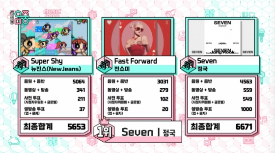 이날 정국은 '음중'에 참석하지는 못했지만 솔로 데뷔곡 'Seven'으로 '음중' 1위에 오르면서 전 세계 아미(팬덤명)들로부터 축하를 받고 있다.