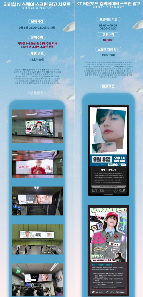 뷔의 중국 최대 팬클럽 '바이두 뷔바'는 총 1만대에 달하는 압도적 규모의 KT 타운보드 광고로 뷔의 솔로 데뷔를 응원한다.