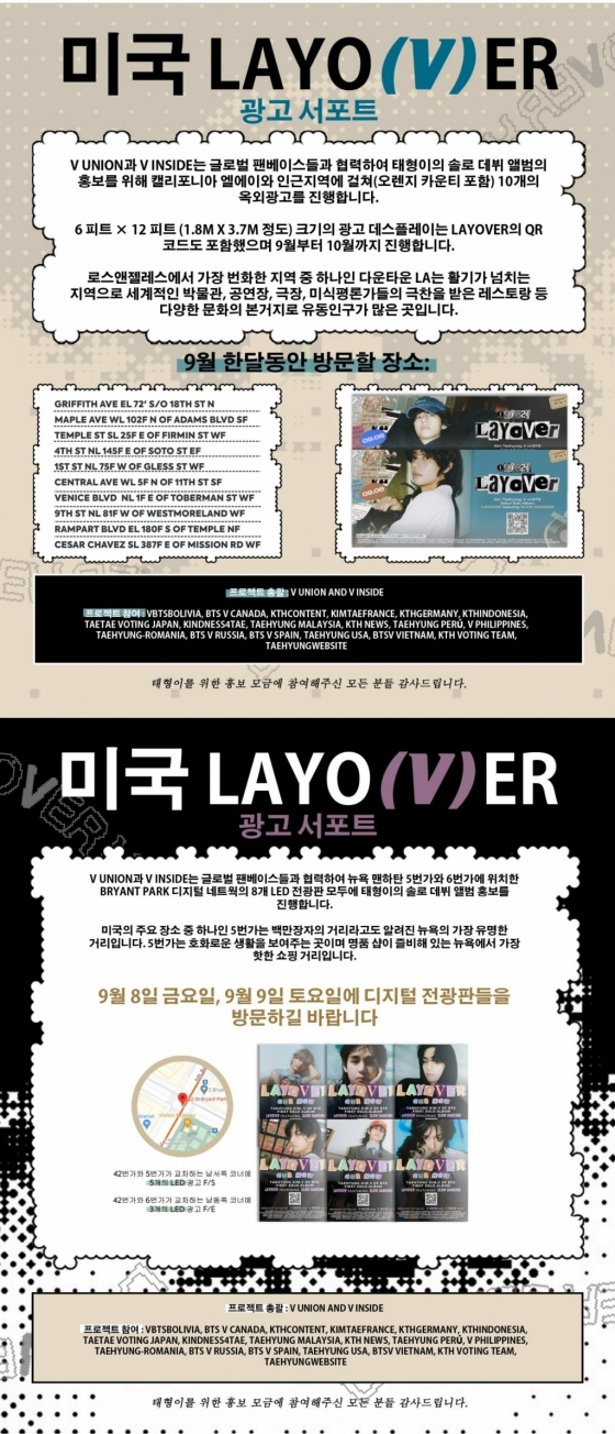 뷔의 팬베이스 '뷔 유니온'과 '뷔 인사이드'는 글로벌 팬베이스와 연합으로 미국 뉴욕과 LA 대도시 18개 대형 전광판 광고를 실시한다.