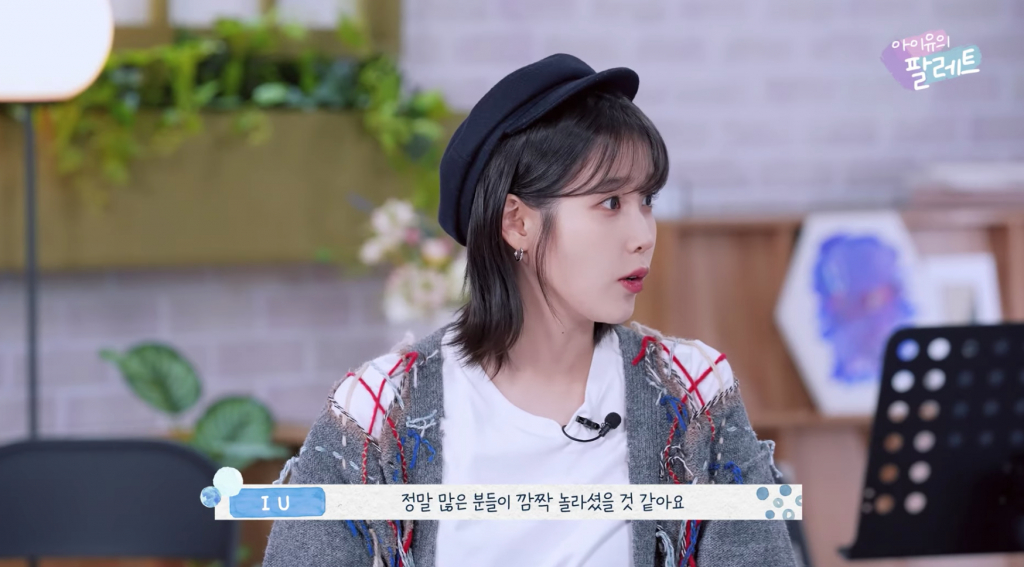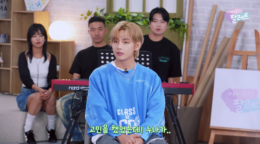 소개를 받은 뷔는 "팬분들의 요청이 많았다. '아이유의 팔레트'가 진짜 좋은 프로그램이라고 하더라. 프로모션이 잡혀 있어서 출연을 고민했는데 누나가 '엄청 레전드 무대를 만들어주겠다'라고 해서 바로 나오게 됐다"라고 말했고 아이유는 "토씨 하나 틀리지 않고 기억하고 계신다. '2023년 김태형의 가장 잘한 일로 만들어주겠다'라고 했다. 반말로 진행하는 게 편할 것 같다고 내게 언질을 주셨다. 저희는 처음 보는 사이는 아니다"라고 말했다.