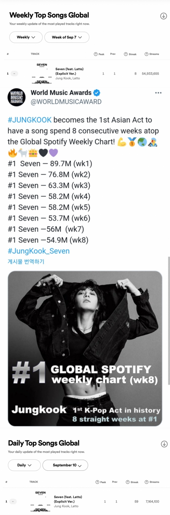 정국이 지난 7월 14일 발매한 솔로 싱글 'Seven'은 세계 최대 음원 스트리밍 플랫폼 스포티파이 9월 1일~7일 자 '위클리(주간) 톱 송 글로벌' 차트에서 1위를 차지했다. 8주 연속 1위 기록이다.