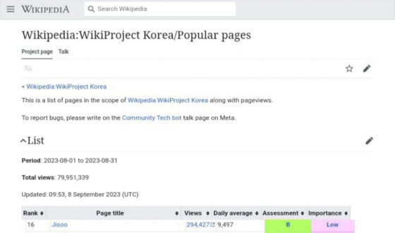 위키프로젝트 코리아(Wikiproject Korea)가 2023년 8월 인기 페이지 순위를 갱신했다. 조회는 8월 1일부터 8월 31일까지 진행됐다. 지수는 조회수 29만4427회로 여자 아이돌 개인 중 1위를 차지하며 글로벌 인기를 입증했다.
