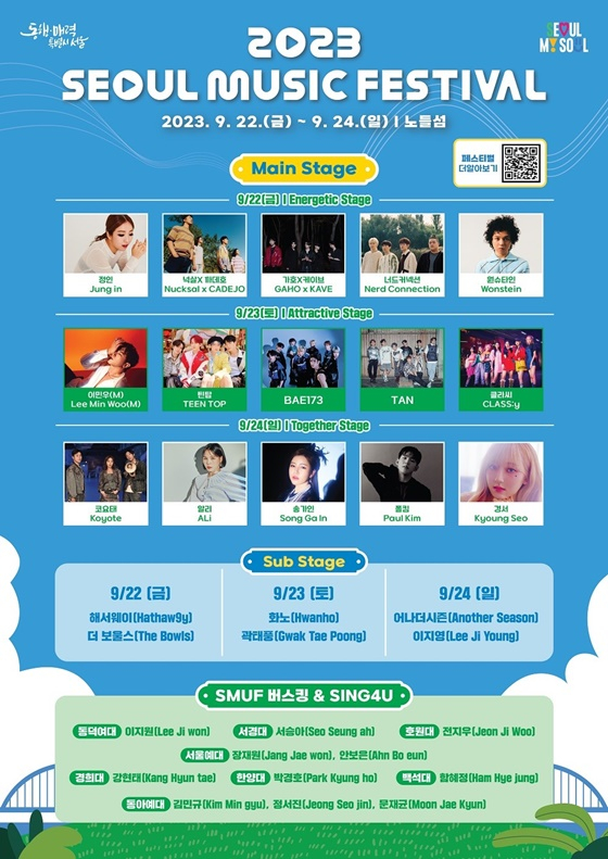 14일 SBS미디어넷 측에 따르면 '2023 서울뮤직페스티벌'(2023 SEOUL MUSIC FESTIVAL, SMUF)은 오는 22일부터 24일까지 사흘 동안 서울시 용산구 노들섬에서 진행되며 유튜브 채널 The K-pop과 서울시를 통해 생중계된다.