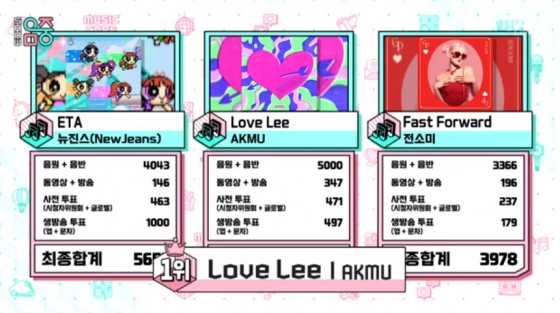 16일 방송된 MBC '쇼! 음악중심'에는 9월 셋째 주 1위 후보로 뉴진스의 'ETA', 악뮤의 'Love Lee', 전소미의 'Fast Forward'가 올랐다.