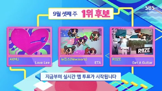 이날 악뮤의 '러브 리'(Love Lee), 뉴진스의 '이티에이'(ETA), 라이즈의 '겟 어 기타'(Get A Guitar) 등 세 곡이 1위 후보에 올랐다.