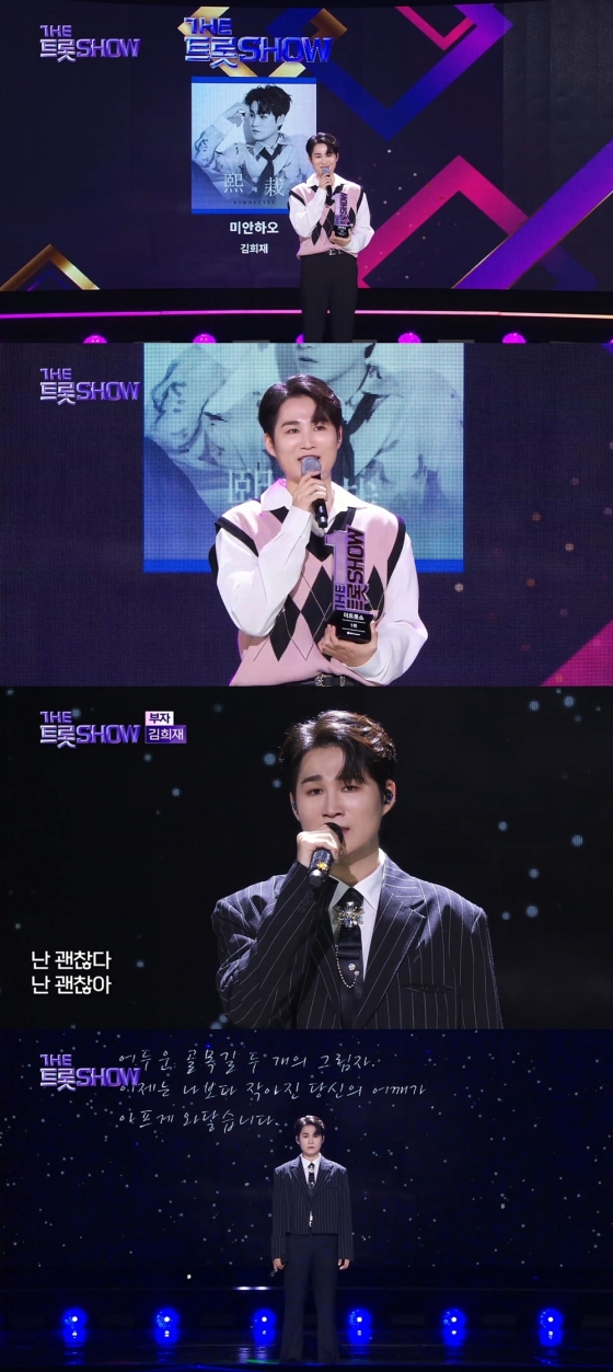 특히 이날 방송에서 김희재는 정규 1집의 수록곡 '미안하오'로 또 한 번 1위를 차지했다. '풍악', '짠짠짠'에 이어 다시 한번 트로피의 주인공이 된 김희재는 "'미안하오'라는 곡은 우리 희랑별을 생각하면서 열심히 부른 노래다. 팬들에게 하고 싶은 말이 담겨있어 부를 때마다 울컥한다. 뜻깊은 1위라고 생각하고 진심으로 감사드린다"라며 소감을 남겼다.