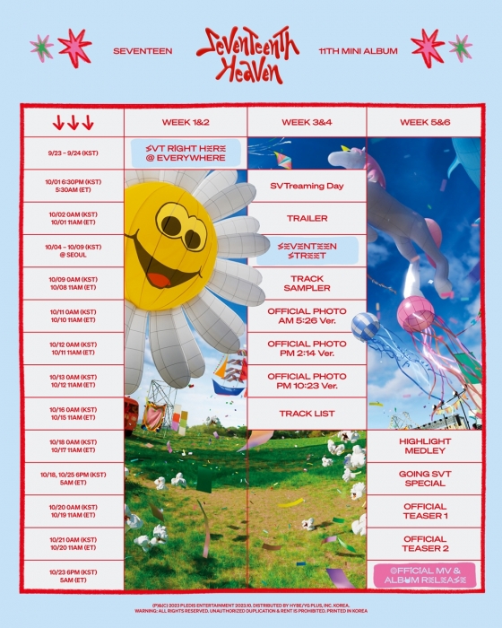 프로모션 스케줄러에 따르면, 오는 23~24일 'SVT RIGHT HERE'을 시작으로 SVTreaming Day, 트레일러, 세븐틴 스트리트, 트랙 샘플러, 오피셜 포토, 트랙리스트, 하이라이트 메들리, '고잉 세븐틴' 스페셜, 오피셜 뮤직비디오 티저 등 다양한 콘텐츠가 차례로 공개된다.