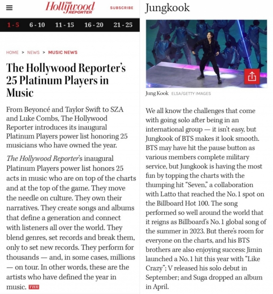 방탄소년단(BTS) 정국이 '할리우드 리포터'(The Hollywood Reporter)가 선정한 '2023년 플래티넘 플레이어 뮤지션'에 오르며 인기를 빛냈다.