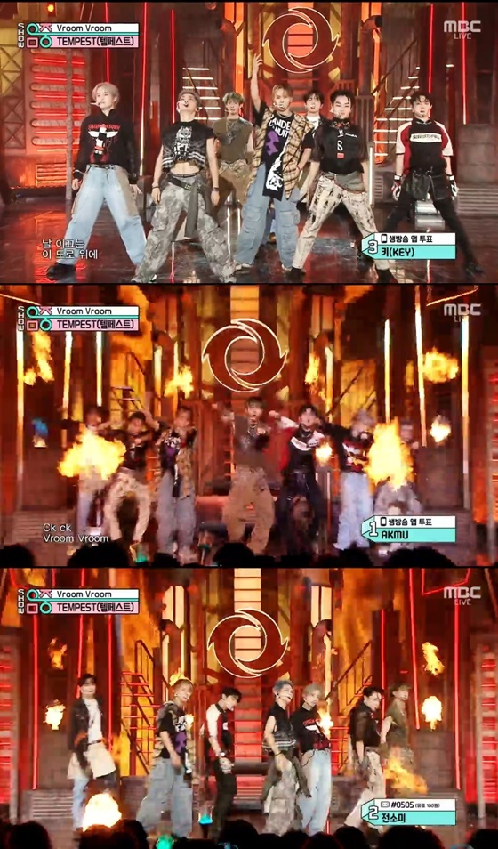 템페스트는 23일 방송된 MBC 음악 프로그램 '쇼! 음악중심'에 출연해 첫 번째 싱글 앨범 '폭풍 속으로' 타이틀곡 '브룸 브룸'(Vroom Vroom) 무대를 선보였다.