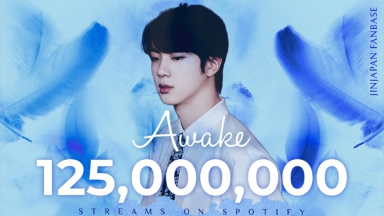 방탄소년단(BTS) 진의 솔로곡 '어웨이크'(Awake)가 스포티파이 1억 2500만 스트리밍을 돌파하며 인기를 빛냈다.