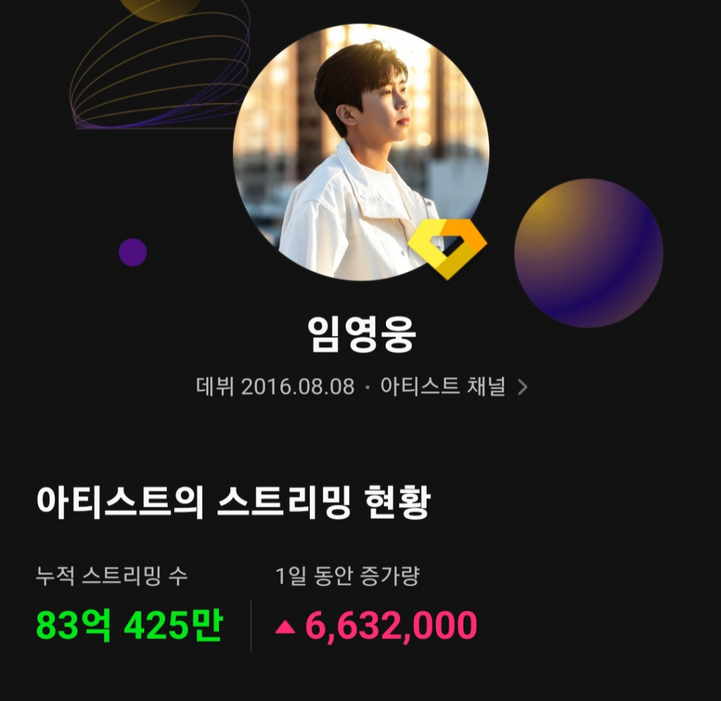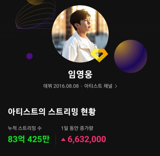 임영웅은 9월 27일 기준 국내 주요 음원 플랫폼 멜론(Melon)에서 누적 스트리밍 83억 회를 넘어섰다. 지난 9월 12일 82억 회 돌파 이후 15일 만에 또 1억 스트리밍이 증가하며 새로운 기록을 썼다. 이날 기준 누적 스트리밍 수는 83억 425만이었다.
