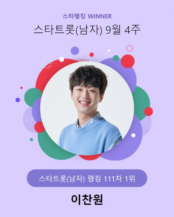 이찬원은 9월 21일 오후 3시 1분부터 9월 28일 오후 3시까지 진행된 9월 4주 스타랭킹 스타트롯 남자 랭킹 투표(111차)에서 1위에 등극했다.