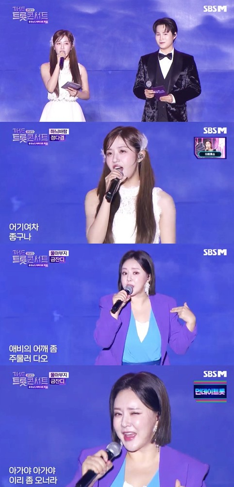 금잔디와 정다경은 2일 오후 8시 방송된 SBS FiL, SBS M '더 트롯 콘서트-금산'에 출연, 충청남도 체육대회 특집으로 꾸며진 무대에 올라 강렬한 존재감을 뽐냈다.