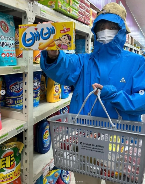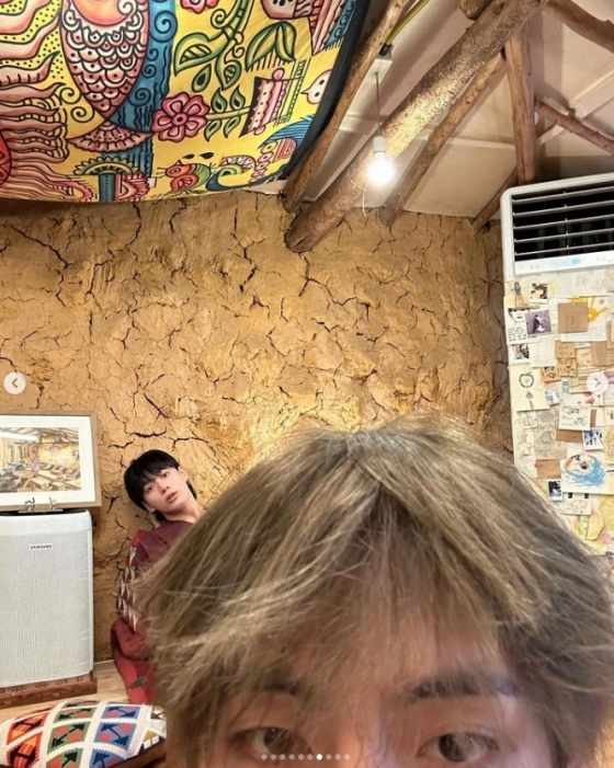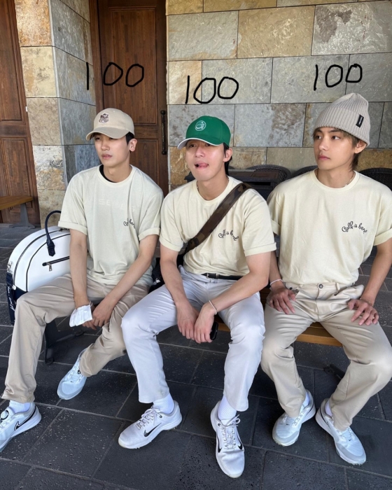 사진 속에는 뷔가 배우 박서준, 박형식 등 '우가팸'이라고 이름 지은 친구들과 모여 똑같은 티셔츠를 입고 국내 모처에 놀러간 모습이다.