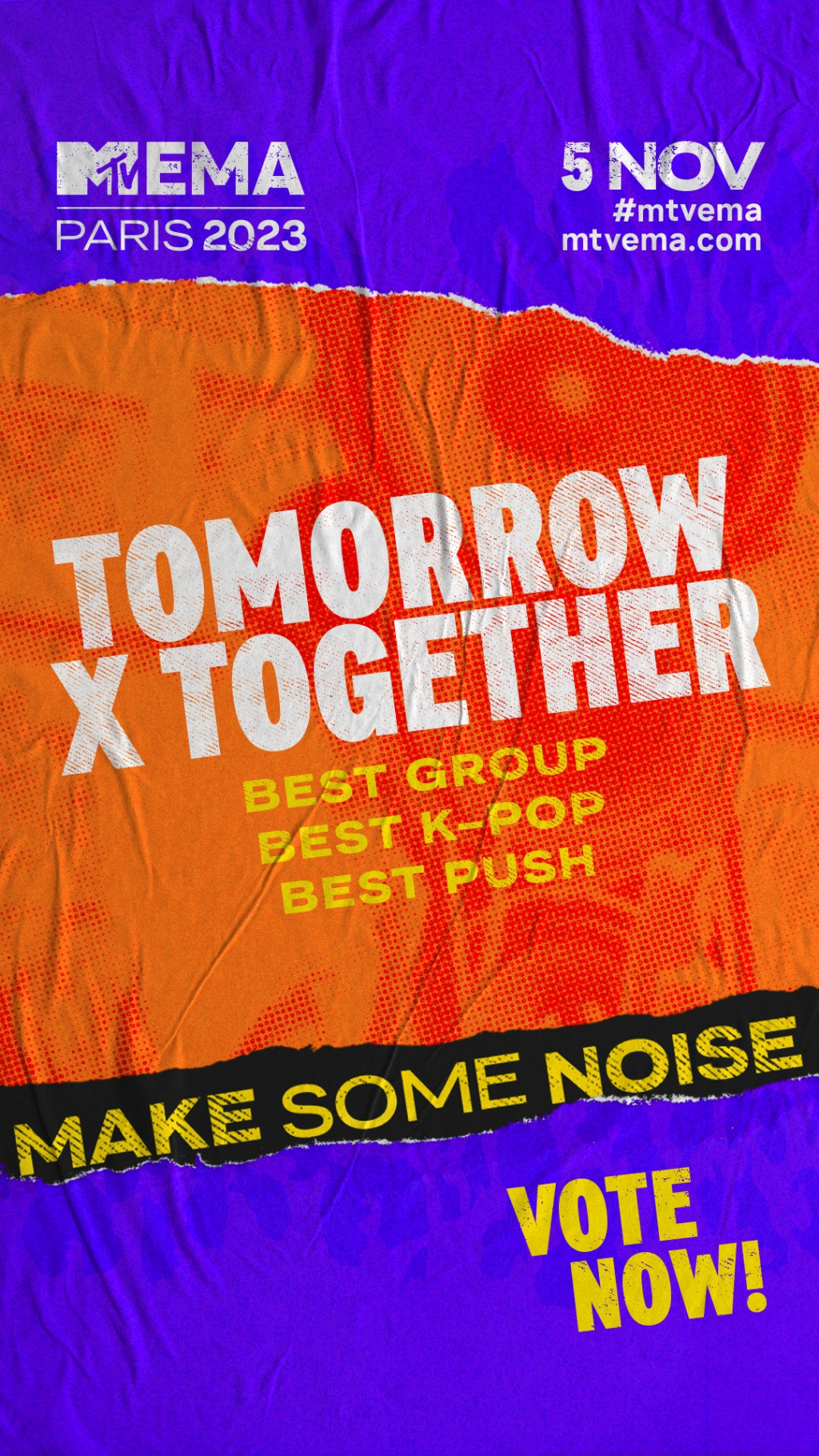 투모로우바이투게더는 'Best Group' 부문에서 원리퍼블릭(OneRepublic), 조나스 브라더스(Jonas Brothers) 등 글로벌 아티스트들과 경쟁한다. 이들은 'MTV PUSH' 캠페인에 선정됐던 아티스트들이 트로피를 두고 경합하는 'Best Push' 후보에도 올랐는데, 지난 9월 미국에서 개최된 '2023 MTV 비디오 뮤직 어워드'에서 이 부문 트로피를 거머쥔 바 있어 그 여세를 몰아 이번에도 수상할지 관심이 쏠리고 있다.