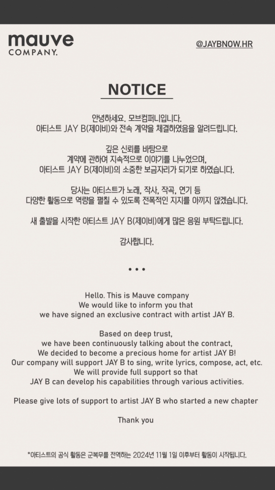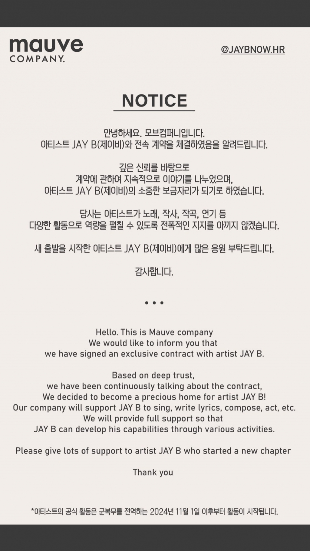 6일 오후 소속사 모브컴퍼니는 공식 SNS에 "아티스트 JAY B(제이비)와 전속 계약을 체결했다. 깊은 신뢰를 바탕으로 계약에 관하여 지속적으로 이야기를 나누었으며, 제이비의 소중한 보금자리가 되기로 했다"라고 밝혔다.