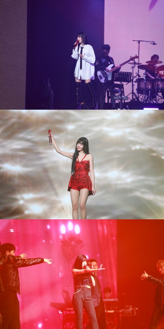 매혹적인 레드 드레스에 왕관을 쓰고 왕좌에 앉은 채 모습을 드러낸 권은비는 '글로벌 퀸'다운 우아한 자태로 등장부터 시선을 압도했다. 지난해 4월 발매한 두 번째 미니 앨범 '컬러(Color)' 타이틀곡 '글리치(Glitch)'와 '크로키(Croquis)'를 연달아 선보이며 '퀸'의 화려한 포문을 열었다.