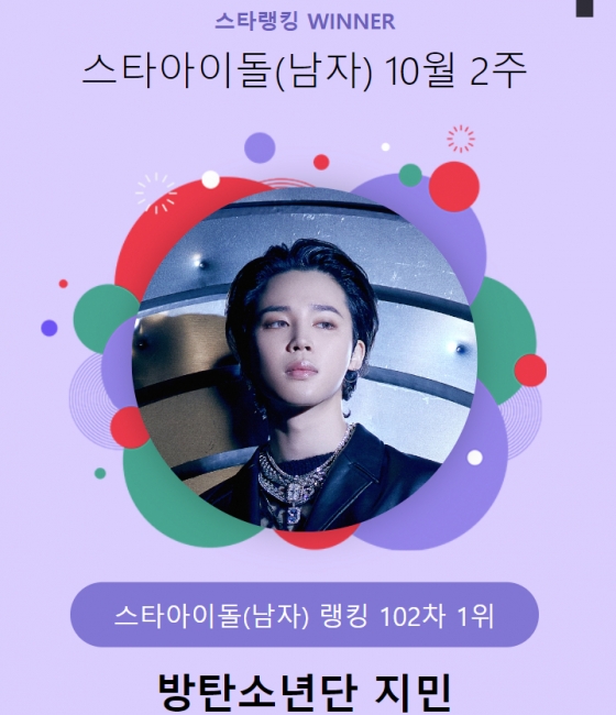 지민은 지난 5일 오후 3시 1분부터 12일 오후 3시까지 진행된 10월 2주(102차) 스타랭킹 스타아이돌 남자 랭킹 투표에서 3만9903표를 얻어 1위에 등극했다.