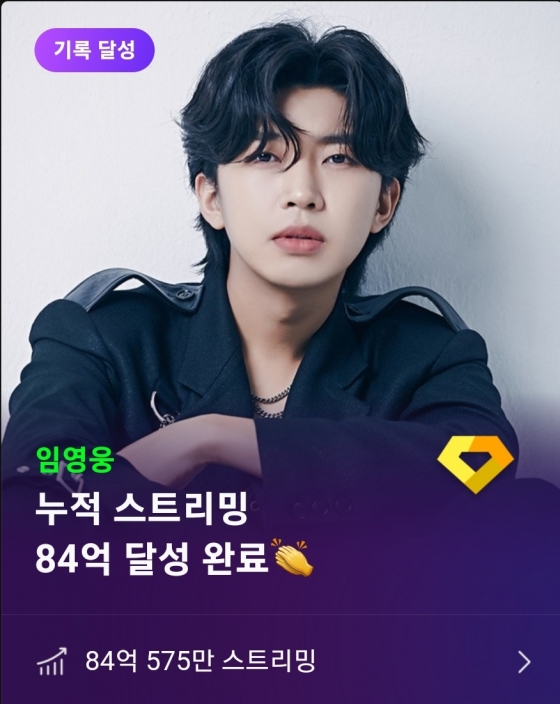 임영웅은 10월 12일 기준 국내 주요 음원 플랫폼 멜론(Melon)에서 누적 스트리밍 84억 회를 넘어섰다. 지난 9월 27일 83억 회 돌파 이후 16일 만에 또 1억 스트리밍이 증가하며 기록 경신을 했다. 이날 기준 누적 스트리밍 수는 84억 575만이었다.