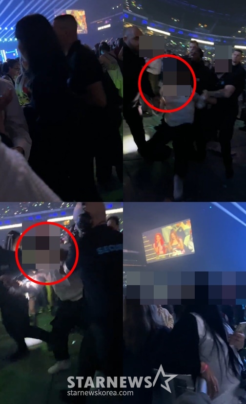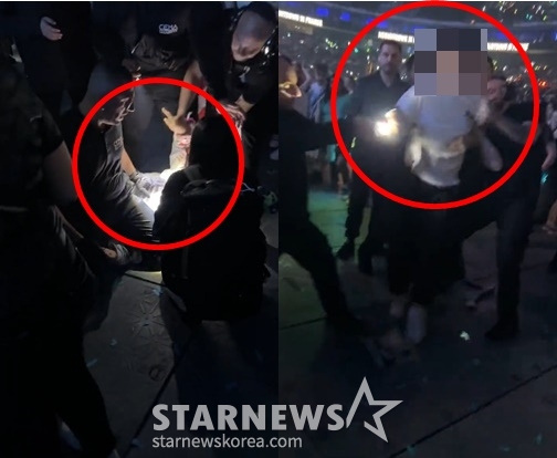 영상에서 한 동양인 남성과 여성은 프랑스 현지 보안요원들 다수에 의해 몸이 제압됐고 공연장에서 쫓겨나는 모습을 보였다. 이를 목격한 다수의 관객들은 "뭐하는 거냐" 등 목소리를 높였지만 보안요원들은 전혀 개의치 않고 동양인 관객들을 쫓아냈다. 당시 관람객 한 켠에선 이 같은 소동이 일어났지만 공연은 버젓이 진행되고 있어 모두를 놀라게 했다.