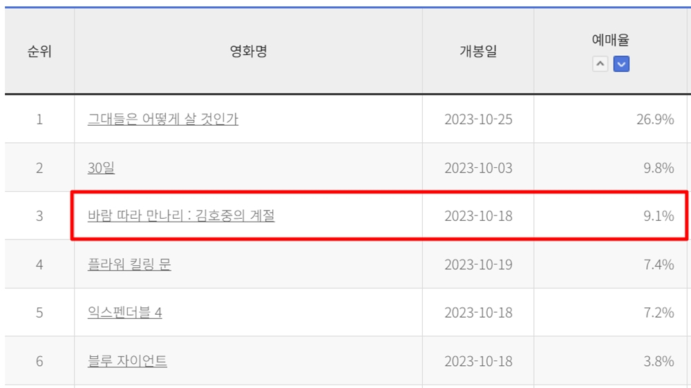 17일 영화진흥위원회 통합전산망에 따르면, 영화 '바람 따라 만나리 : 김호중의 계절'이 17일 오전 8시 기준 동시기 개봉작 실시간 예매율 1위를 기록했다. 이는 동시기 개봉 예정인 '익스펜더블 4', '엑소시스트 : 믿는 자', '블루 자이언트', '괴담만찬' 등 모든 경쟁작들을 제친 기록이다.