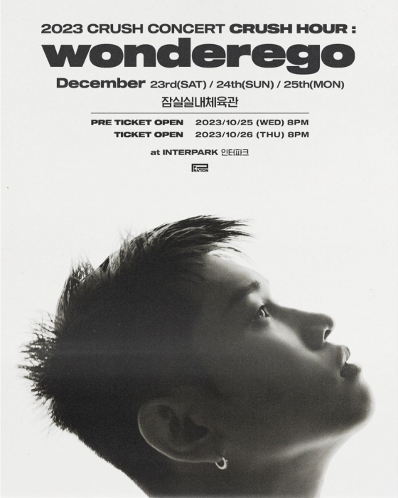 크러쉬는 지난 19일 오후 공식 SNS를 통해 12월 23일부터 25일까지 서울 잠실 실내체육관에서 열리는 연말 단독 콘서트 2023 CRUSH CONCERT 'CRUSH HOUR : wonderego(원더이고)' 포스터를 게재했다.