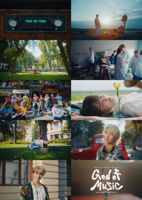 세븐틴은 20일 하이브 레이블즈 공식 채널에 오는 23일 오후 6시(이하 한국시간) 발매되는 미니 11집 'SEVENTEENTH HEAVEN'(세븐틴스 헤븐)의 타이틀곡 '음악의 신' 뮤직비디오 티저 영상을 게재했다. 영상은 음악을 찾는 듯한 '지지직' 거리는 소음과 함께 'MUSIC NOT FOUND'라는 문구로 시작된다.