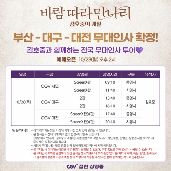 CGV서면, 대구, 대전에서 진행하는 무대인사는 23일 오후 2시부터 예매 가능하며, 무대인사에 대한 자세한 내용은 CGV 공식 홈페이지와 모바일 앱, 스크린X 공식 SNS 채널을 통해 확인 가능하다.
