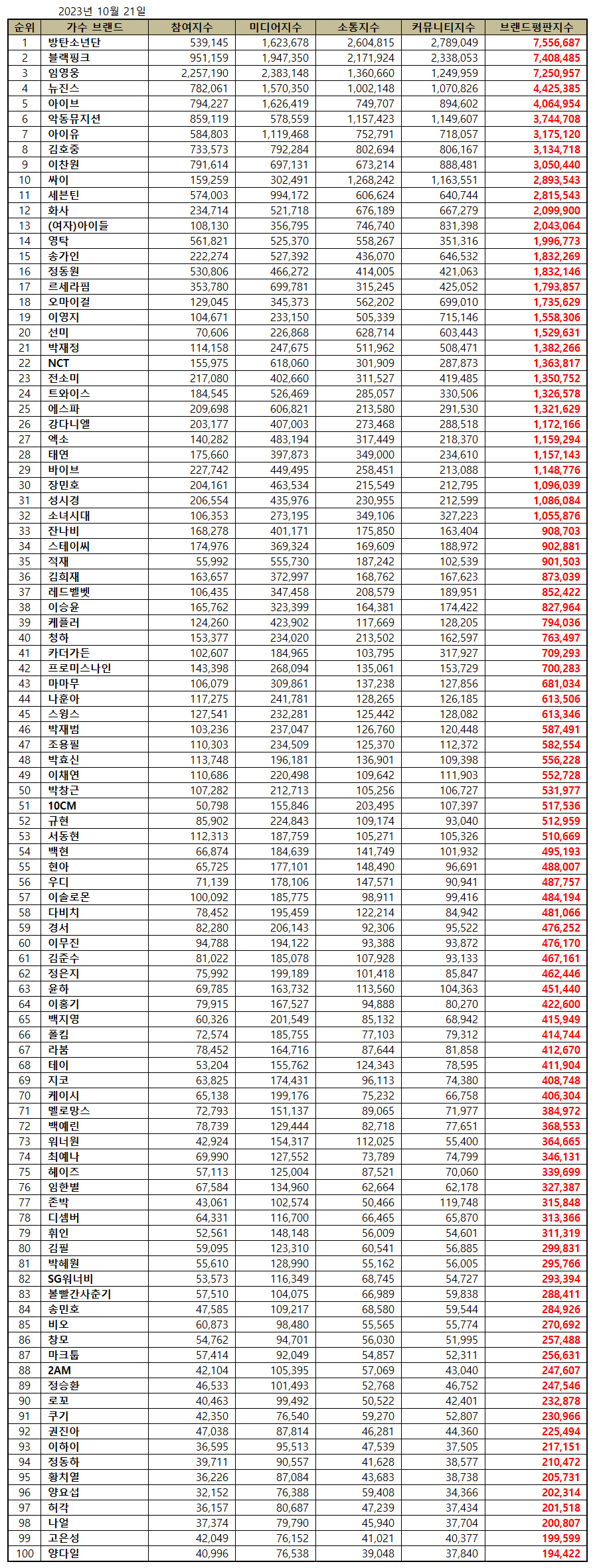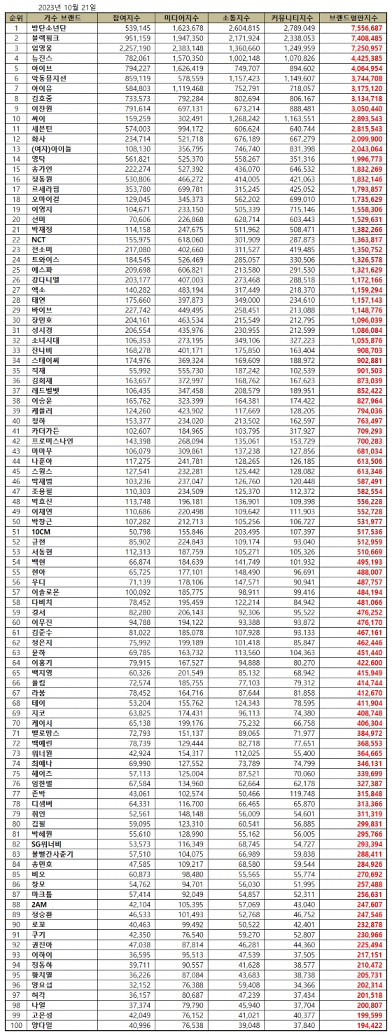 한국기업평판연구소는 2023년 9월 21일부터 2023년 10월 21일까지의 가수 브랜드 빅데이터 110,854,377개를 분석하여 소비자들의 브랜드 참여, 미디어, 소통, 커뮤니티 분석을 하였다. 지난 9월 가수 브랜드 빅데이터 102,128,705개와 비교하면 8.54% 증가했다.