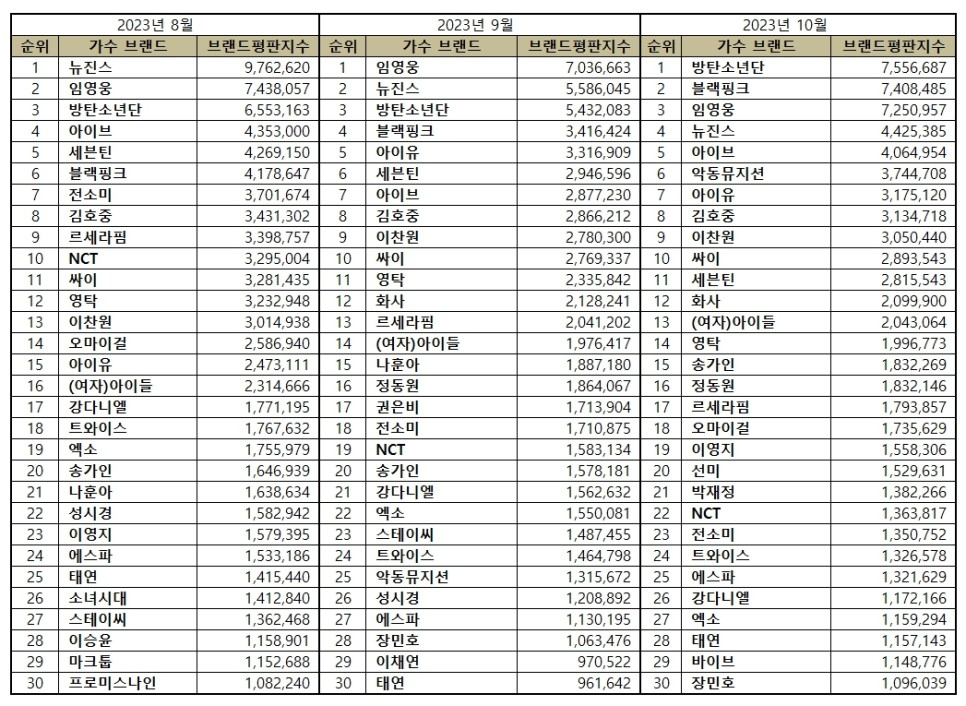 2023년 10월 가수 브랜드평판 30위 순위는 방탄소년단, 블랙핑크, 임영웅, 뉴진스, 아이브, 악동뮤지션, 아이유, 김호중, 이찬원, 싸이, 세븐틴, 화사, (여자)아이들, 영탁, 송가인, 정동원, 르세라핌, 오마이걸, 이영지, 선미, 박재정, NCT, 전소미, 트와이스, 에스파, 강다니엘, 엑소, 태연, 바이브, 장민호 순으로 분석됐다.