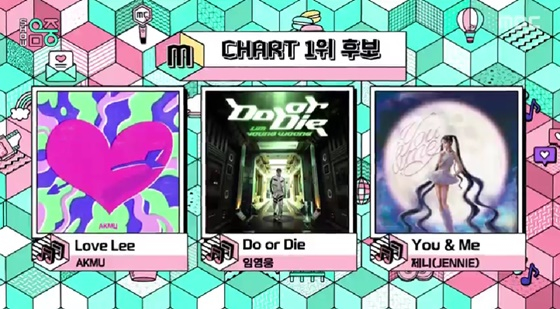 이날 1위 후보로는 악뮤의 '러브 리'(Love Lee), 임영웅의 '두 오어 다이'(Do or Die), 블랙핑크 제니의 '유 앤드 미'(You & Me)가 이름을 올렸다.