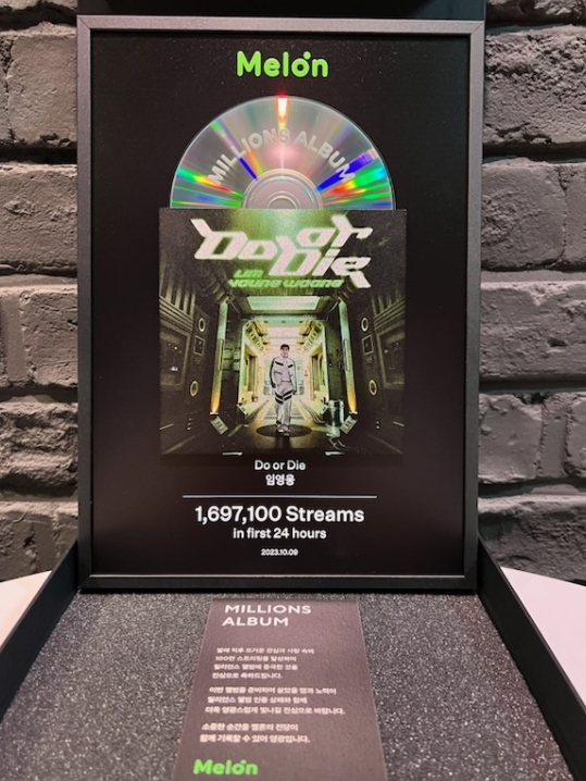 상패에는 임영웅의 'Do or Die' 커버 이미지와 함께 발매 24시간 만에 169만 7100 스트리밍 기록이 새겨졌다.