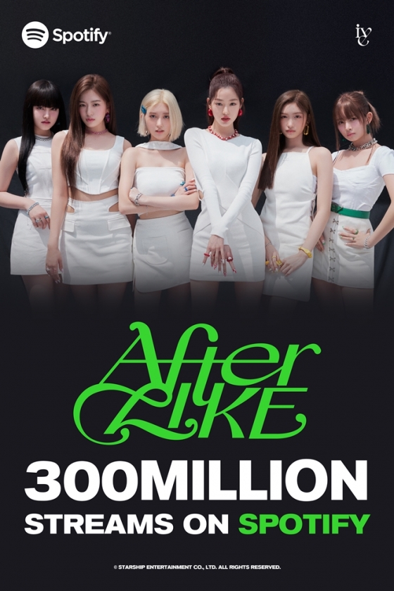 25일 소속사 스타쉽엔터테인먼트에 따르면, 아이브는 지난 24일 스포티파이에서 3번째 싱글 타이틀곡 '애프터 라이크'로 3억 스트리밍을 돌파했다.