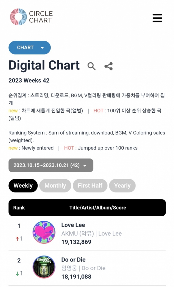 임영웅은 한국음악콘텐츠협회가 운영하는 써클차트(구 가온차트) 42주차(2023년 10월 15일~2023년 10월 21일) 디지털차트에서 'Do or Die'로 전체 2위를 기록했다. 1위는 악뮤의 'Love Lee'로 임영웅은 솔로가수로서는 가장 높은 순위를 기록했다.