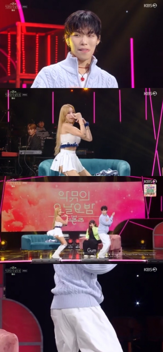 이후 그는 자신의 신곡 'Gum(껌)'에 대해 "난 되게 다양한 맛이 있다는 걸 보여주고 싶었다"며 포인트 안무 동작을 선보였다. 또 제시는 스쿼트 자세를 한 채 엉덩이를 튕기며 이찬혁에 직접 'Gum(껌)' 안무를 알려주기도 했다. 이수현은 이찬혁의 모습에 "이거 안 하면 안 되냐"며 눈을 가린 채 인상을 찌푸려 웃음을 안겼다.