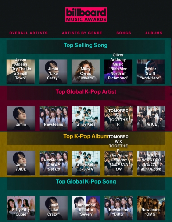 현지 시간으로 지난 26일 '빌보드 뮤직 어워즈'(이하 BBMA)가 공식 홈페이지를 통해 발표한 2023년 BBMA 후보 명단에 따르면 지민이 본상을 포함한 4개 부문에 올라 한국 솔로 가수 최다 노미네이트의 쾌거를 거뒀다.