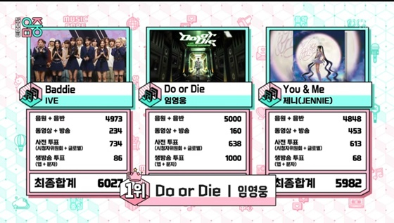 28일 방송된 MBC 음악 프로그램 '쇼! 음악중심'(이하 '음악중심')에는 임영웅의 '두 올 다이'(Do or Die)와 걸 그룹 아이브 '배디'(Baddie), 블랙핑크의 제니 '유 앤 미'(You & Me)가 1위 후보에 올랐다.