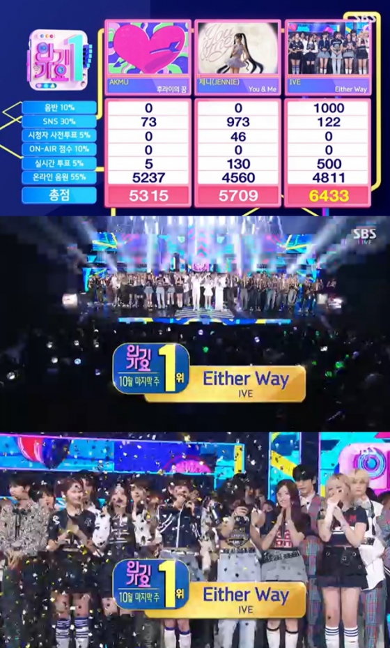 29일 오후 방송된 SBS 음악 프로그램 '인기가요'에서는 아이브가 1위를 차지했다. 이날 10월 5주차 1위 후보로 악뮤 '후라이의 꿈', 블랙핑크 제니 'You & Me'(유 앤 미), 아이브 'Either Way'(이더 웨이)가 올랐다.