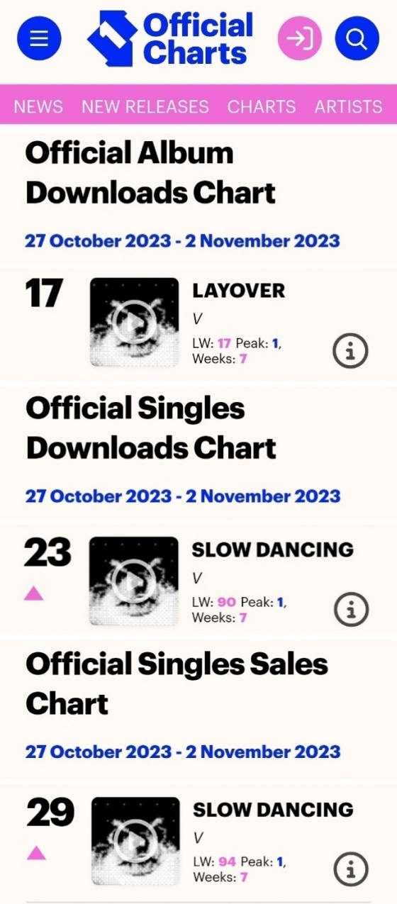 뷔의 솔로 앨범 '레이오버'(Layover)는 10월 4째 주 영국 오피셜 '앨범 다운로드 차트' 17위에 안착하며 7주 연속 차트인했다.