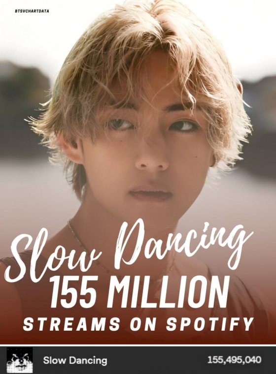 방탄소년단(BTS) 뷔의 솔로곡 '슬로우 댄싱'(Slow Dancing)이 세계 최대 음원 플랫폼 스포티파이에서 1억 5500만 스트리밍을 기록하며 인기를 빛냈다.