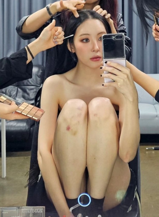 공개된 사진 속엔 이번 타이틀곡 '스트레인저'(STRANGER) 활동기 모습이 담겨있다. 특히 무릎을 안고 메이크업을 받는 모습엔 시퍼런 멍이 보여 이목을 끈다.