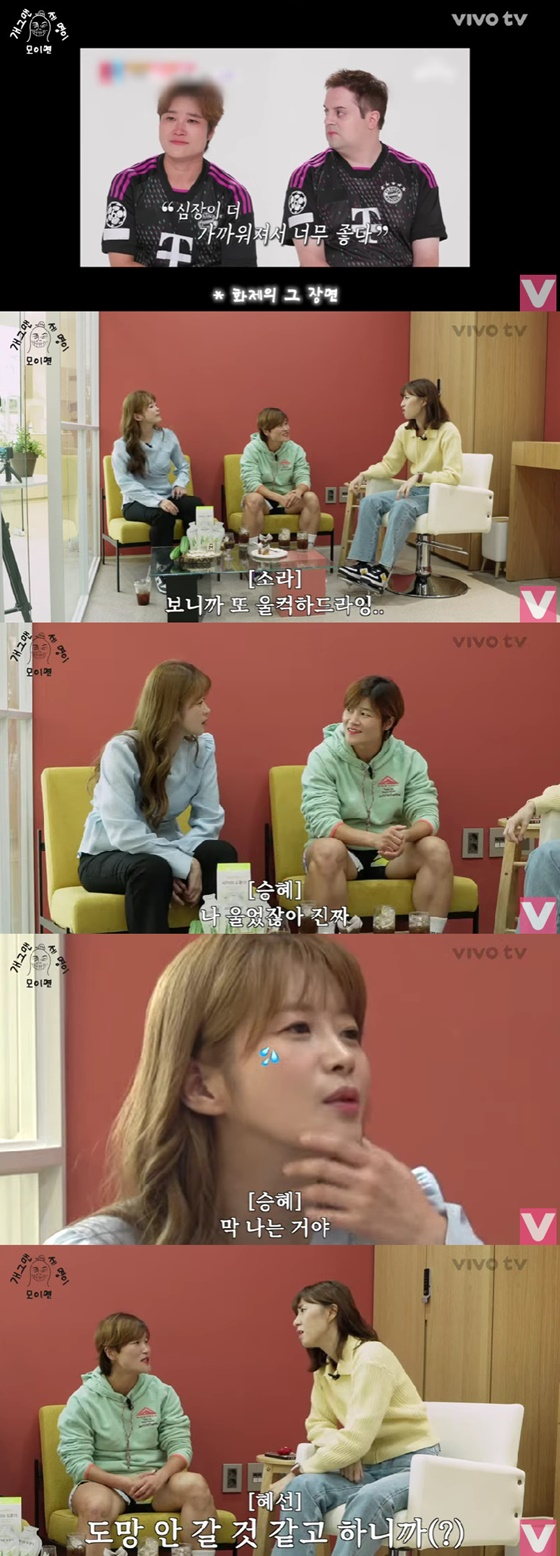 이와 관련해 박소라는 "언니 내용 다 알고 있는데도 보니까 울컥하더라"라고 말했다. 김승혜 역시 "나도 울었다. 너무 '웃기다' 하다가 눈물이 나더라"며 "이런 얘기까지 다 하는구나 그게 대단하더라. 술 먹으면서 하는 얘기를 너무 다 해서"라고 전했다.