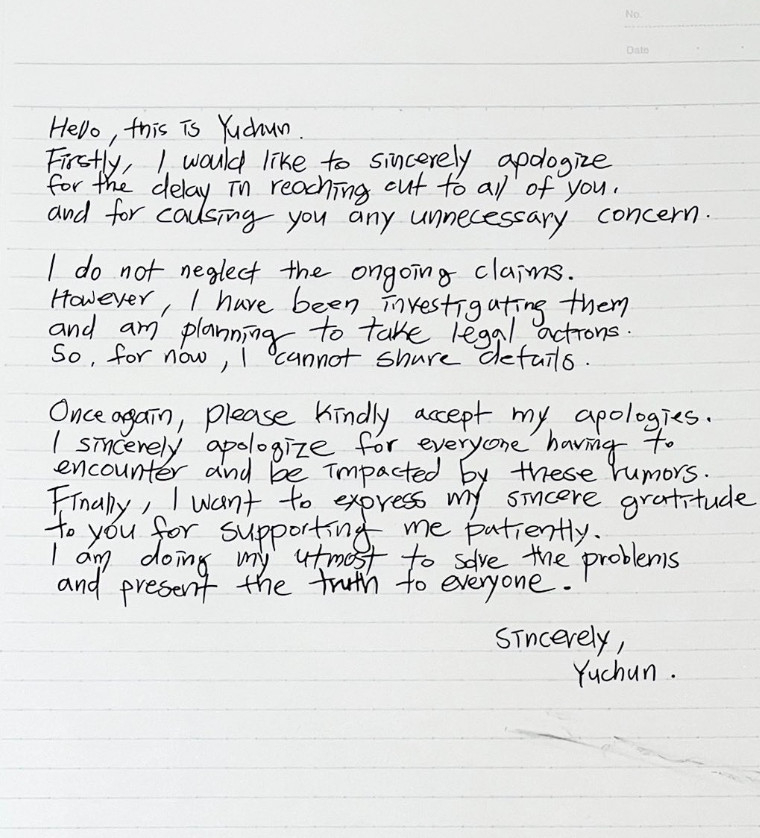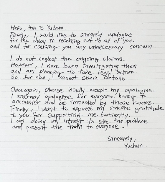 가수 겸 배우 박유천이 자필 사과문을 전했다.