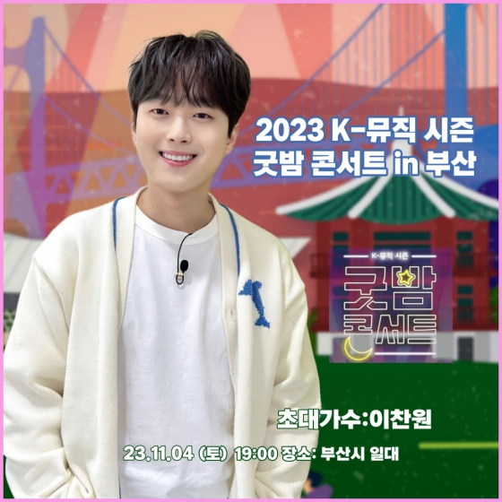 이찬원은 11월 4일 오후 7시 부산광역시 해운대구 수영강변대로 영화의 전당 야외극장에서 열리는 '2023 K-뮤직 시즌 : 굿밤 콘서트 in 부산 무대에 오른다.