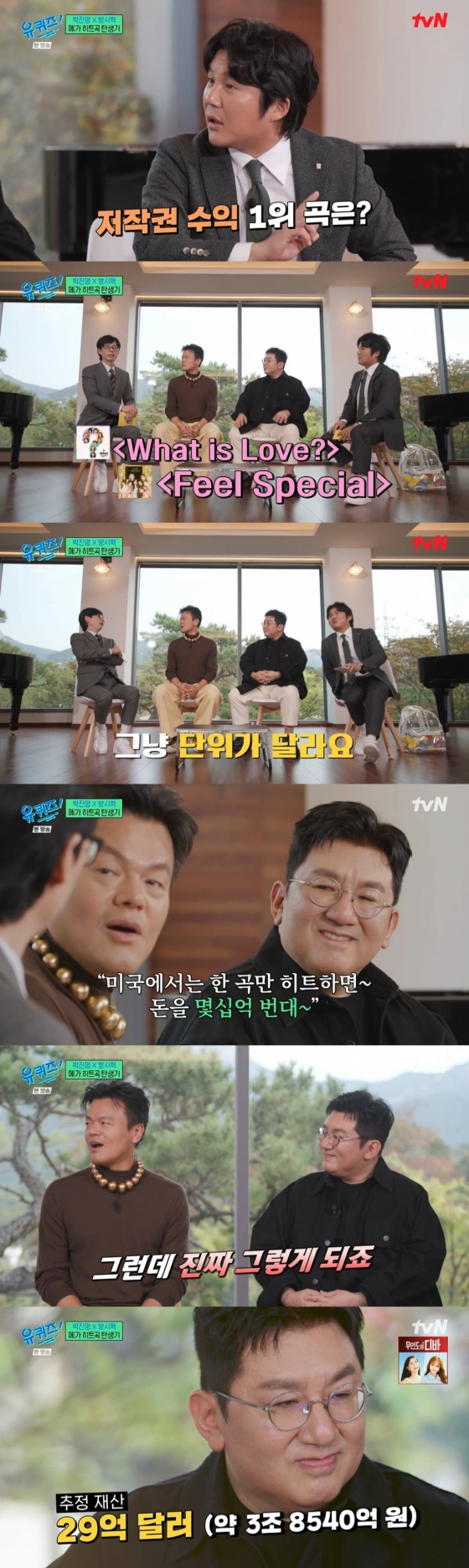 지난 1일 방송된 tvN 예능 프로그램 '유 퀴즈 온 더 블럭'에 출연한 JYP엔터테인먼트 CCO 박진영, 하이브 의장 방시혁은 자신의 저작권 수익 1위 곡을 공개했다.